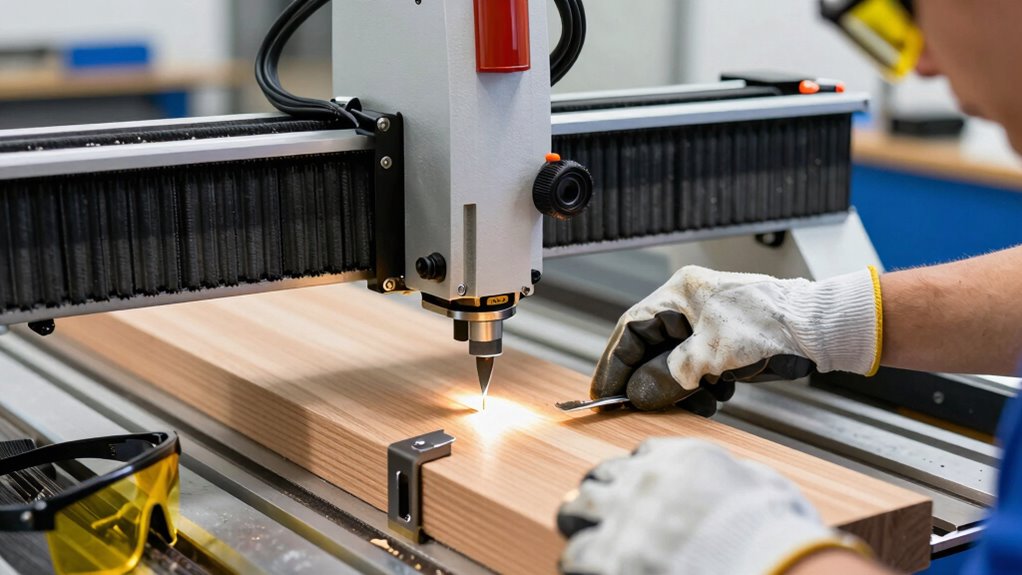 Properly aligning your workpiece and tool is essential for both safety and precision in CNC routing. Start by selecting the right material, ensuring it’s stable and properly supported. Use effective clamping methods to secure the workpiece firmly, preventing any shifting during cutting. Double-check the material’s placement against your machine’s zero point to verify alignment. Proper clamping not only keeps the workpiece steady but also reduces vibrations that can cause inaccuracies or accidents. Confirm that the tool is correctly aligned with the workpiece by visually inspecting and testing the setup before starting the cut. Material selection plays a crucial role in ensuring consistent results and minimizing errors. Accurate material selection combined with reliable clamping methods ensures your workpiece stays in position, minimizing errors and preventing costly mistakes or safety hazards during the routing process.