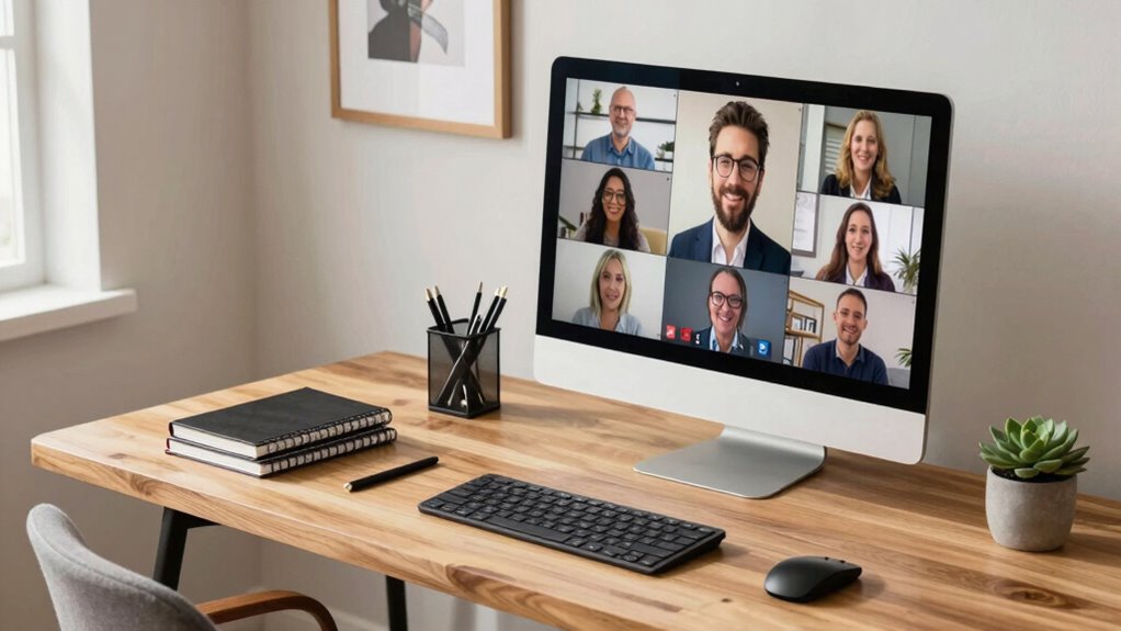 Distractions can quickly derail your focus during calls, making it hard to communicate effectively. To minimize these issues, use background blur to keep your environment private and eliminate visual clutter. This feature helps you appear polished without revealing distracting elements behind you. Additionally, activate noise reduction tools available on many video platforms to block out background sounds like chatter or household noises. Consider investing in a quality microphone with noise-canceling capabilities for clearer audio. Find a quiet space where interruptions are less likely, and inform others around you of your meeting to avoid unexpected disruptions. By controlling your environment with background blur and noise reduction, you guarantee your message stays clear and your professionalism remains intact during every call.