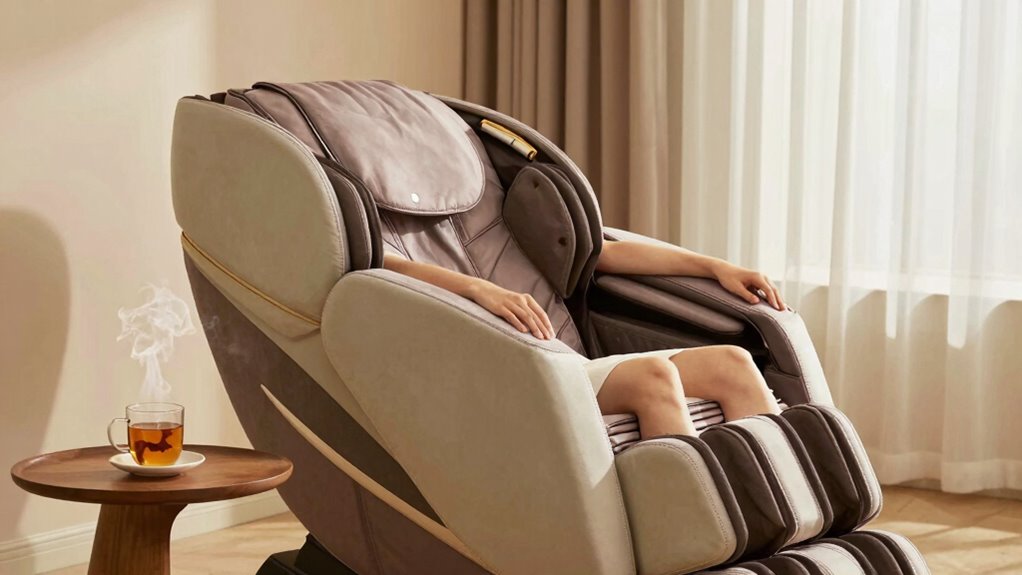 Establishing a regular massage chair routine can considerably reduce stress levels and promote relaxation. One key reason is the aromatherapy benefits many massage chairs offer, filling your space with calming scents like lavender or chamomile that enhance your experience. Additionally, modern massage chair features such as adjustable rollers, multiple massage modes, and heat therapy target specific tension points, providing tailored relief. Regular use helps your body adapt to relaxation cues, lowering cortisol levels and reducing anxiety over time. It becomes a reliable self-care habit that not only eases muscle pain but also creates a mental sanctuary. Incorporating self-care routines into your relaxation habits can further enhance your overall well-being and promote a radiant complexion. Consistent sessions can help reinforce stress reduction techniques, making relaxation more effective. Developing a consistent routine allows your body to anticipate and respond to relaxation signals more effectively. By making massage sessions part of your routine, you cultivate a peaceful environment that nurtures both your body and mind, helping you unwind more effectively.