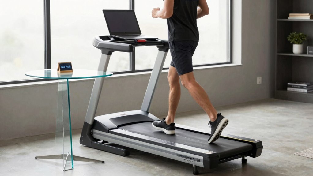 You can use a treadmill desk while walking, but running isn’t recommended for safety reasons. Running on a treadmill desk can compromise desk ergonomics and increase the risk of accidents. For ideal running safety, stick to walking at a comfortable pace that maintains proper posture and avoids strain. This ensures you stay productive without risking injuries or sacrificing ergonomic benefits, making your treadmill desk experience both safe and effective.